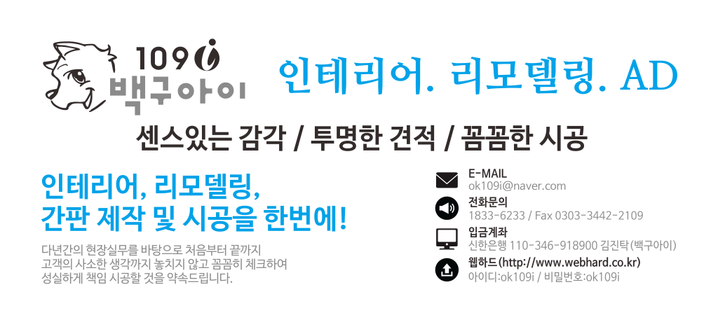 고객만족센터 : 010-9988-8109 / FAX : 0504-347-8109 / E-MAIL : ok109i@naver.com